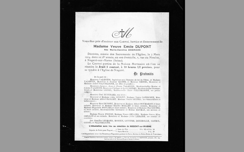 André Falcimaigne, grand-père d'Anne Falcimaigne, épouse Madeleine Dupont en 1911. La famille Dupont semble issue de la région parisienne bien qu’elle soit installée depuis 1880 à Nogent-sur-Marne. Le père était quincaillier à Paris et le grand-père a été carrossier-sellier sur les Champs-Élysées. C’est ce que la famille sait.